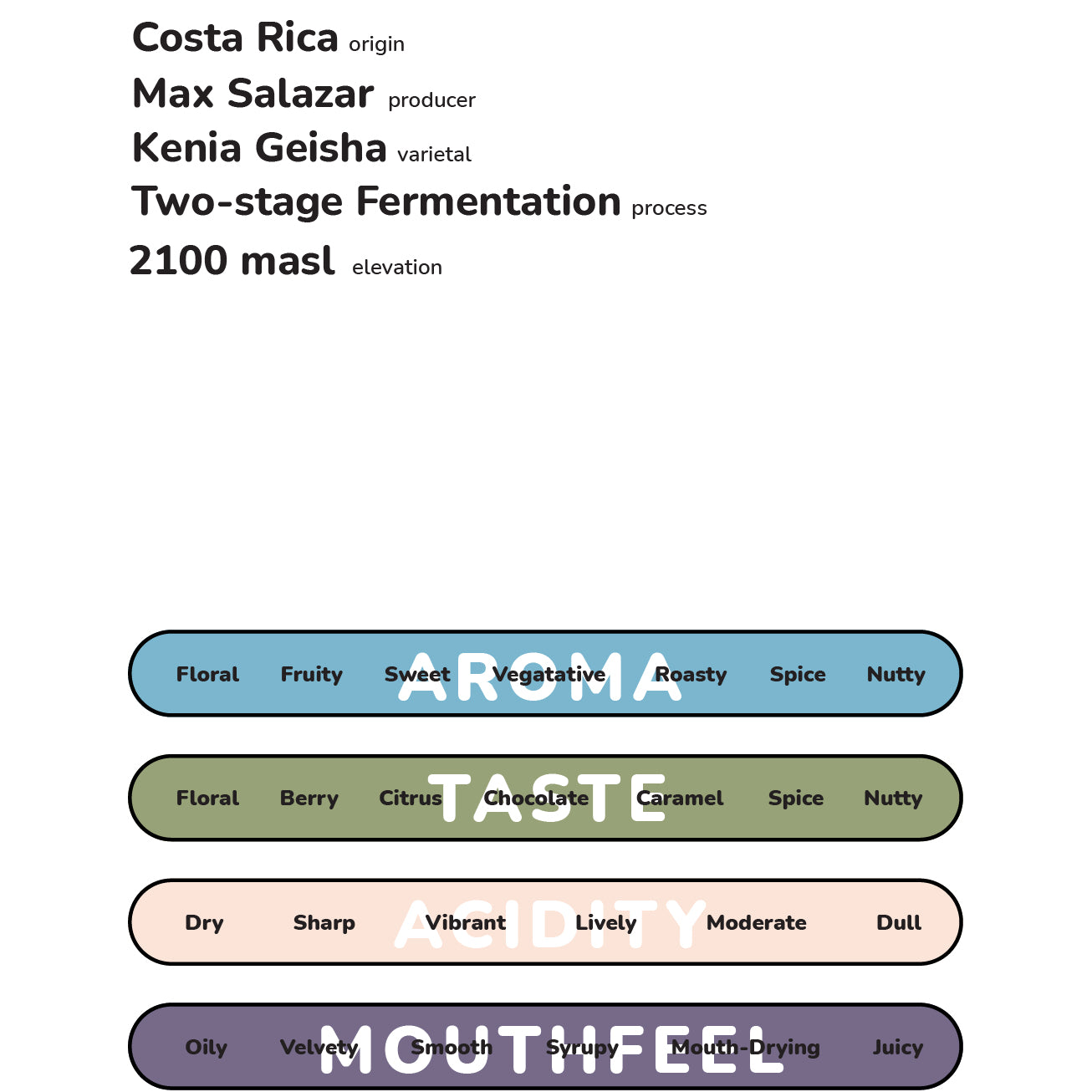 Costa Rica: originMax Salazar: farmKenia Gesha: varietalTwo-Stage Fermentation: process2100 masl: elevation