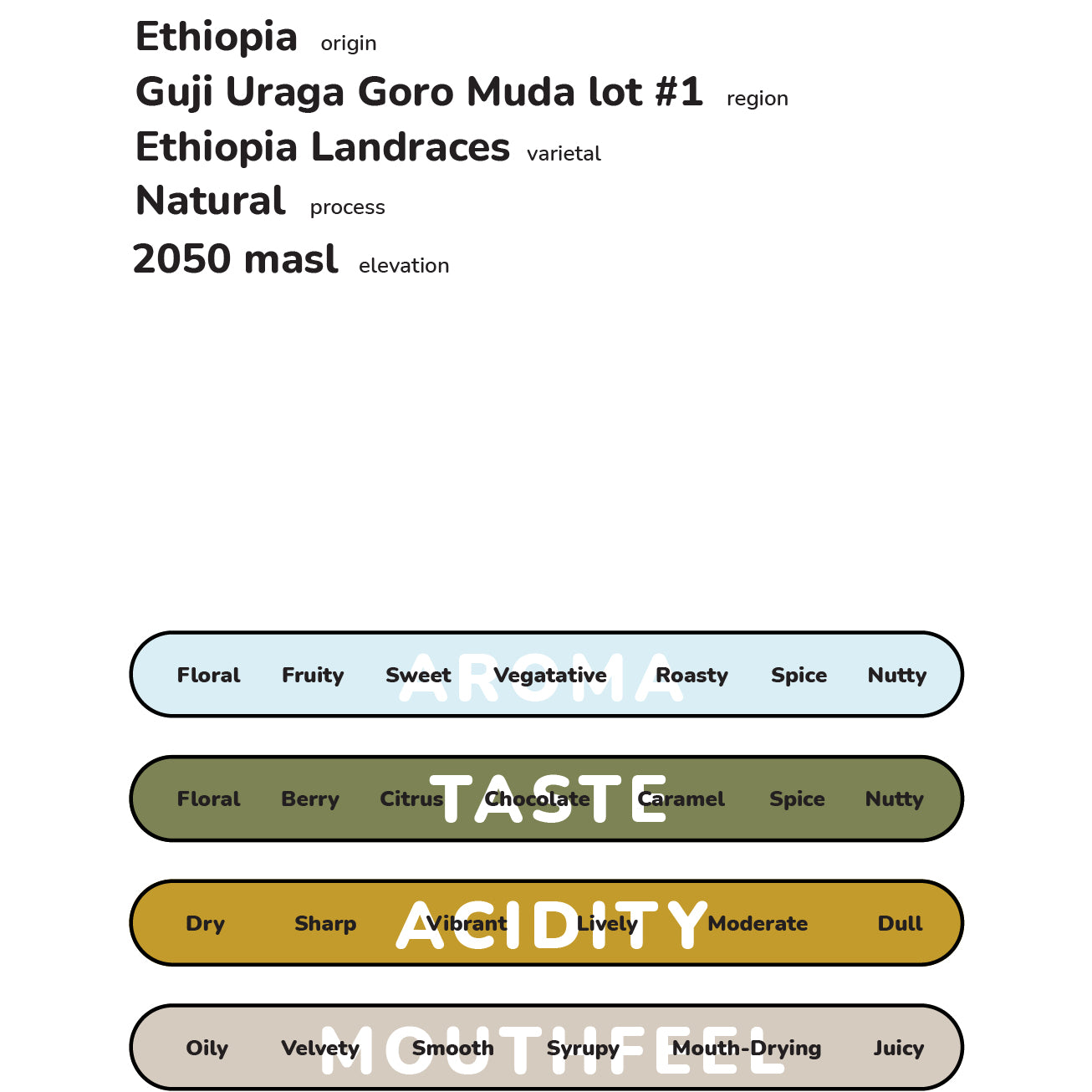 Ethiopia: originGuji Uraga Goro Muda Lot #1: farmerEthiopia Landacres: varietalNatural: process2050 masl: elevation