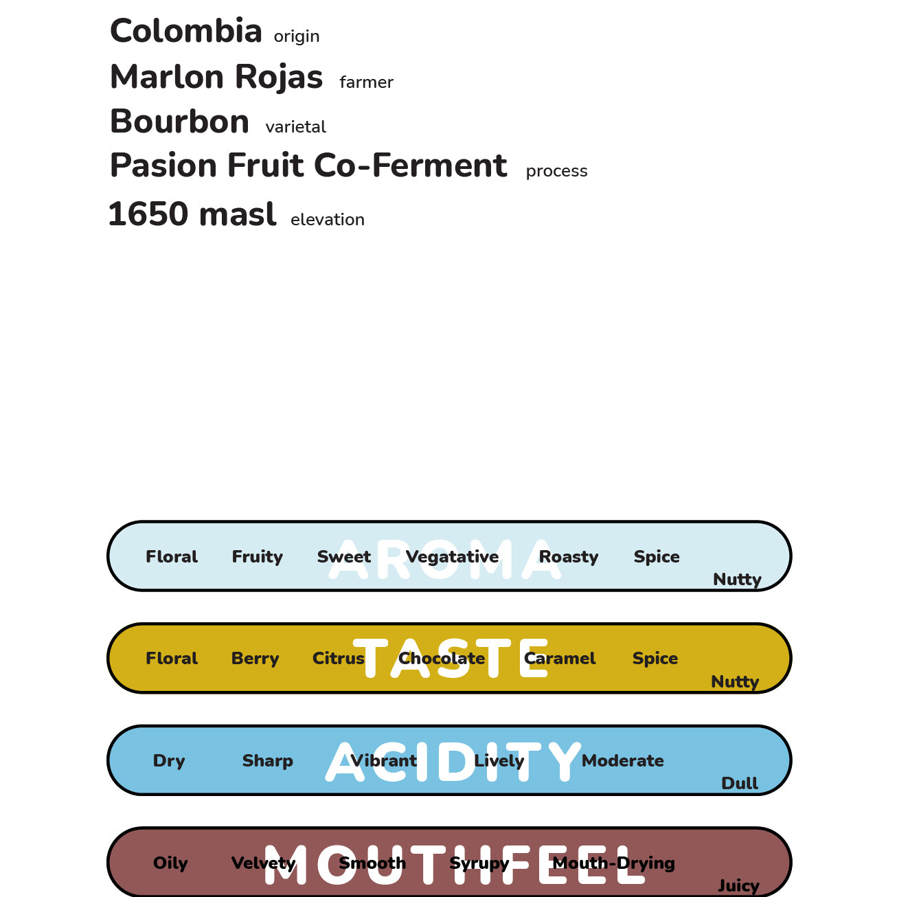 Colombia: originMarlon Rojas: farmerBourbon: varietalPassion Fruit Co-Ferment: process1650 masl: elevation
